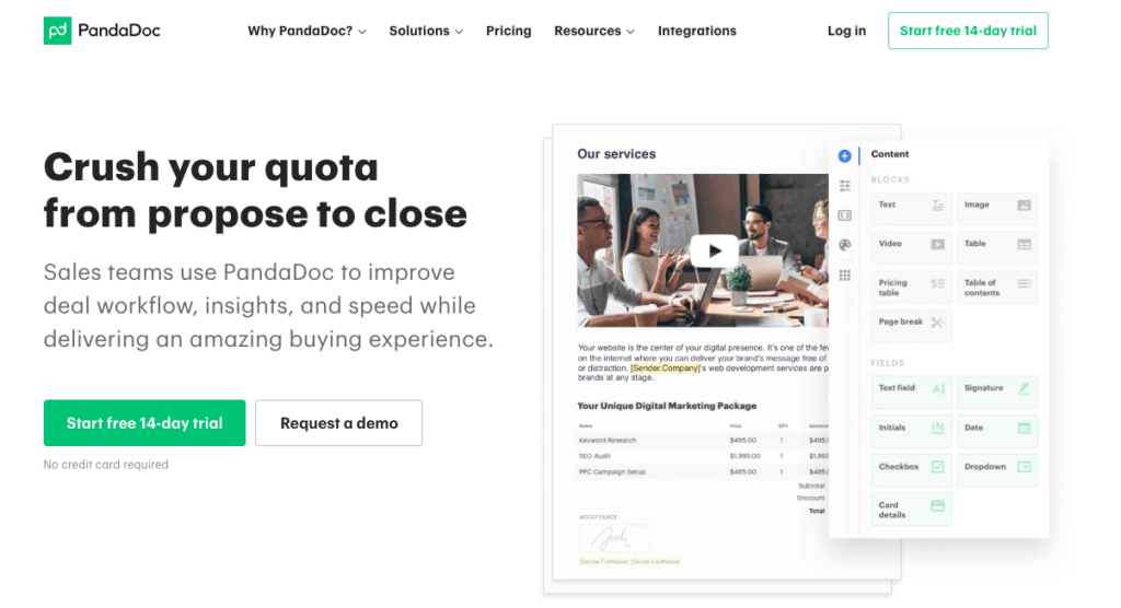 PandaDoc is an innovative document management and e-signature platform that revolutionizes the way businesses create, send, and sign digital documents. It simplifies the document workflow process, making it efficient, secure, and hassle-free. With PandaDoc, businesses can create professional documents easily using customizable templates or starting from scratch. The platform offers a user-friendly interface with intuitive editing tools, allowing users to add text, images, tables, and other elements to create visually appealing and engaging documents.PandaDoc also simplifies the process of obtaining signatures by offering electronic signature functionality. Users can send documents for electronic signatures, and recipients can sign them securely from anywhere, on any device. This eliminates the need for printing, scanning, and mailing physical documents, saving time and resources.