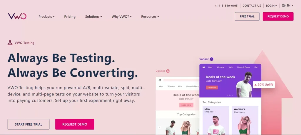 VWO, short for Visual Website Optimizer, is a comprehensive tool that empowers businesses to optimize their websites for enhanced user experience and improved conversion rates. It provides a range of features and functionalities designed to help businesses run experiments, perform A/B testing, track user behavior, and make data-driven decisions to optimize their website performance. VWO allows businesses to create variations of their website and test them against each other to determine which version yields better results. It offers insights into visitor behavior, such as heatmaps and clickmaps, allowing businesses to understand how users interact with their websites. With VWO, businesses can uncover valuable insights, make informed changes, and continuously optimize their website to enhance user engagement and achieve their conversion goals.